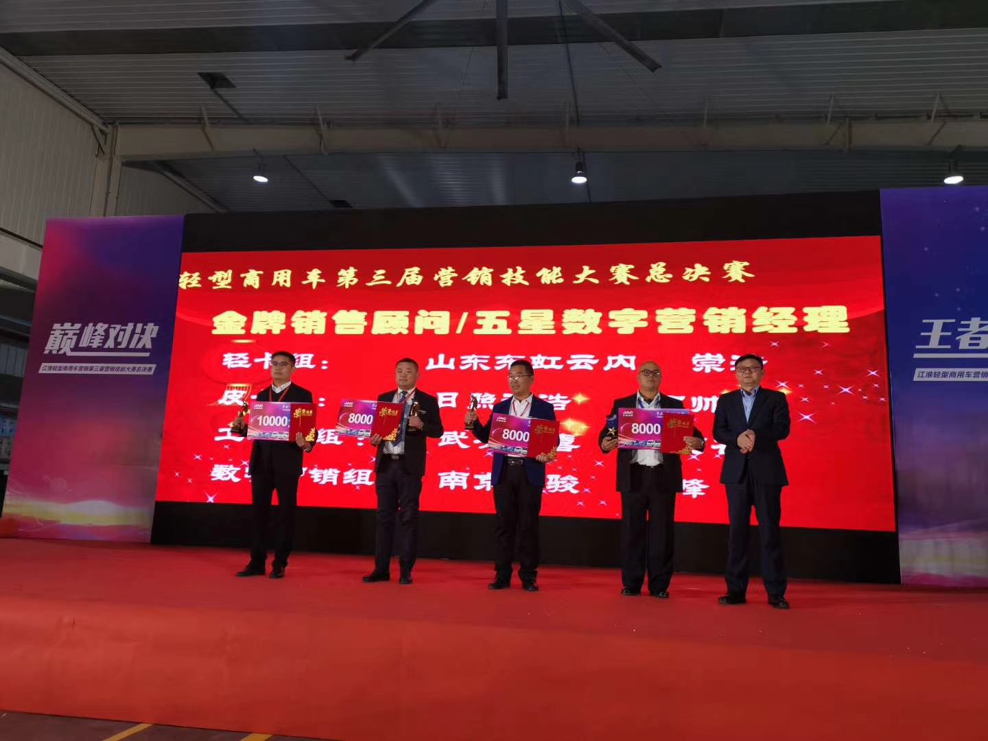 本次總決賽輕卡組競賽的內(nèi)容是“人氣比拼、創(chuàng)意視頻、理論測評、知識闖關(guān)、產(chǎn)品推介、情景演練”六大環(huán)節(jié),歷時兩天。設(shè)置了5個獎項,分別為金獎(金 牌銷售顧問)獎金10000元、銀獎(銀牌銷售顧問)獎金8000元、銅獎(銅牌銷售顧問)獎金6000元、優(yōu) 秀二網(wǎng)(銅牌銷售顧問)獎金5000元、鼓勵獎獎金3000元。