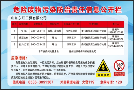 山東東虹工貿(mào)有限公司現(xiàn)就危險(xiǎn)廢物污染防治責(zé)任信息公開(kāi)如下: