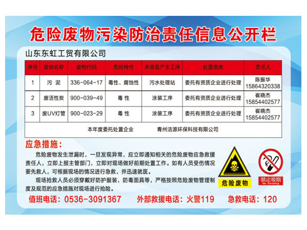 山東東虹工貿(mào)有限公司現(xiàn)就危險(xiǎn)廢物污染防治責(zé)任信息公開如下: